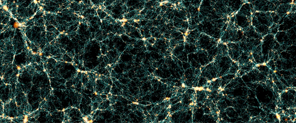 Kép: részlet a Euclid Flagship szimuláció katalógusából, ahol minden pont egy galaxist jelöl. A sötét anyag halók középpontjában lévő nagyobb galaxisok és kisebb, ún. kísérő galaxisaik együttesen rajzolják ki az Univerzum nagyléptékű anyageloszlását: galaxis halmazokat, a közöttük feszülő filamentumokat, és az üres régiókat (voidokat). Forrás: Jorge Carretero & Pau Tallada (PIC / Euclid Konzorcium). A képfeldolgozás a Splotch szoftverrel történt.